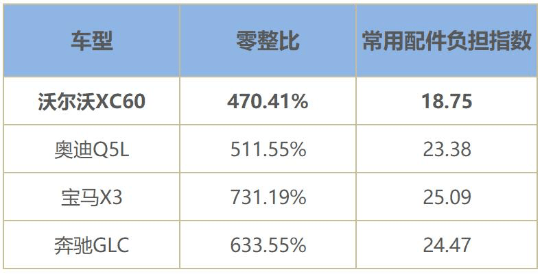 XC60在保持零整比低于同级别BBA车型的同时,常用配件负担指数依旧在同级参测豪华车型中处于最低水平。18.75的常用配件负担指数,远低于同级别车型奥迪Q5L的23.38、宝马X3的25.09、奔驰GLC的24.47。常用配件负担指数的下降,实实在在降低了沃尔沃车主日常维修的零部件价格。