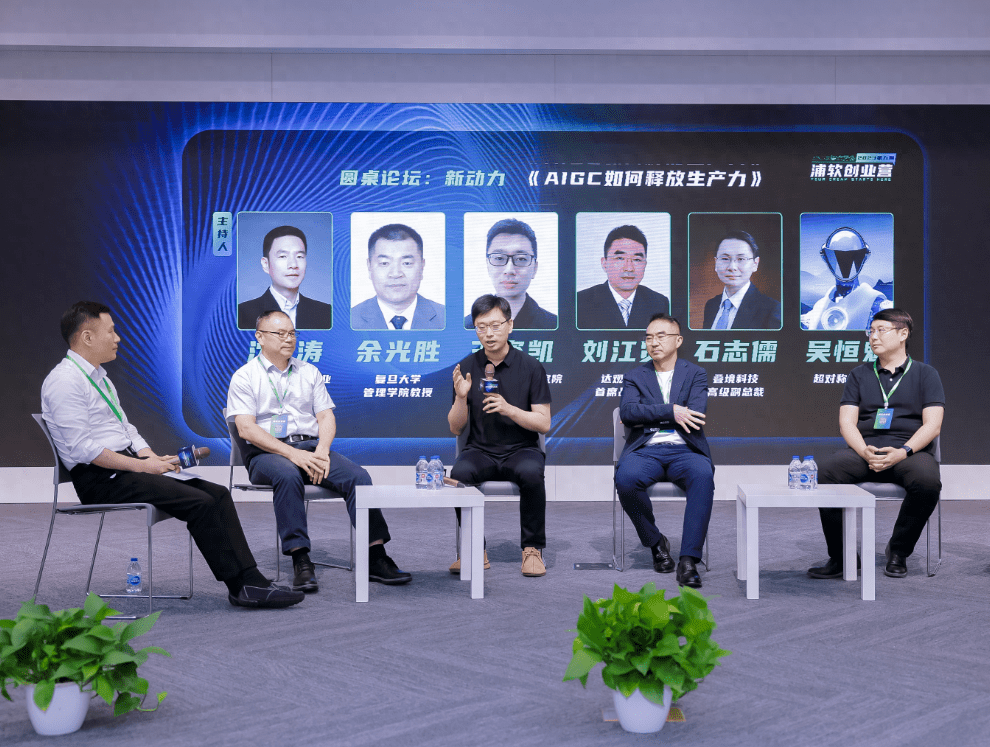 科技创新策源,培育“超前孵化”新模式,离不开“产-学-研”的交流共通。在圆桌论坛环节,上海市人工智能行业协会副秘书长沈涛,对话复旦大学管理学院教授余光胜、上海人工智能研究院总工程师王资凯、达观数据首席战略官刘江贤、叠境科技高级副总裁石志儒与超对称技术公司创始人吴恒魁,共同探讨人工智能时代AIGC如何释放生产力。