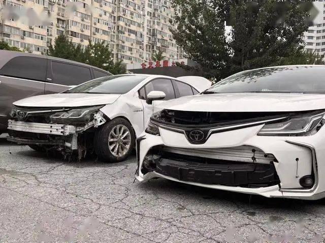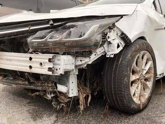 不仅如此,这辆车四面都有碰撞痕迹,车头撞掉了一半,车身侧面已经凹凸不平,后保险杠都掉了。