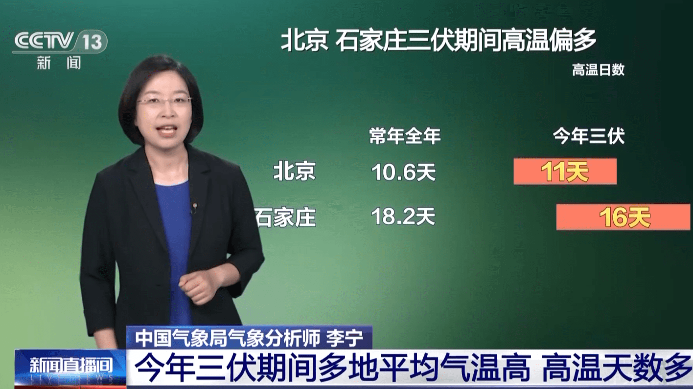 另外在额济纳旗还有甘肃的敦煌等地,高温总天数也是同期最多的。另外华北平原这一带也经历了异常炎热的三伏天。从高温天数的距平来看,在天津、河北还有山西的部分地区,高温天数都是偏多了5~10天左右,像北京和石家庄,在今年三伏期间,高温出现的天数甚至跟常年全年平均的高温总天数是接近的。
