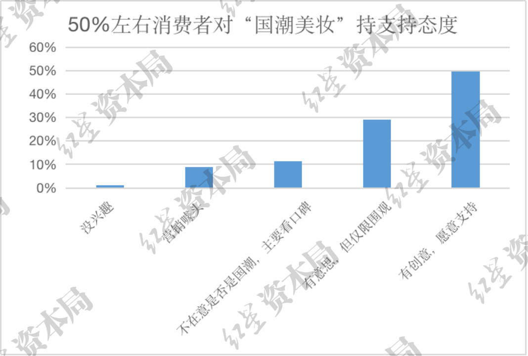 据艾媒咨询数据,2022年有50%左右的消费者对“国潮美妆”持支持态度。可见,如今国产化妆品也被众多消费者接受认可。