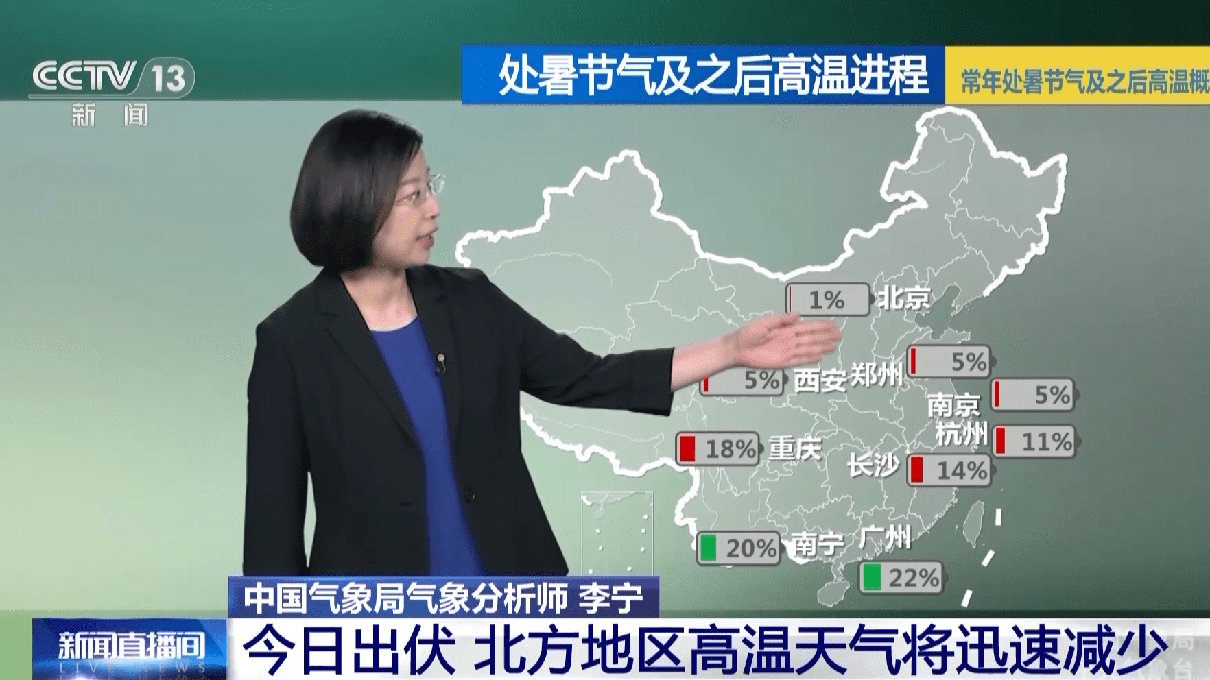 通常三伏过后,北方地区的高温天气将会迅速减少。可以看到在很快到来的处暑节气及以后,北方多地出现高温天气的概率已经非常低了,大概不足5%。而在南方后期还会继续出现高温天气,像江南华南这一带,后面还有接近20%左右的高温天气会继续出现,像是华南这一带通常在9月份甚至最晚到10月初,还有过出现最晚高温的记录。