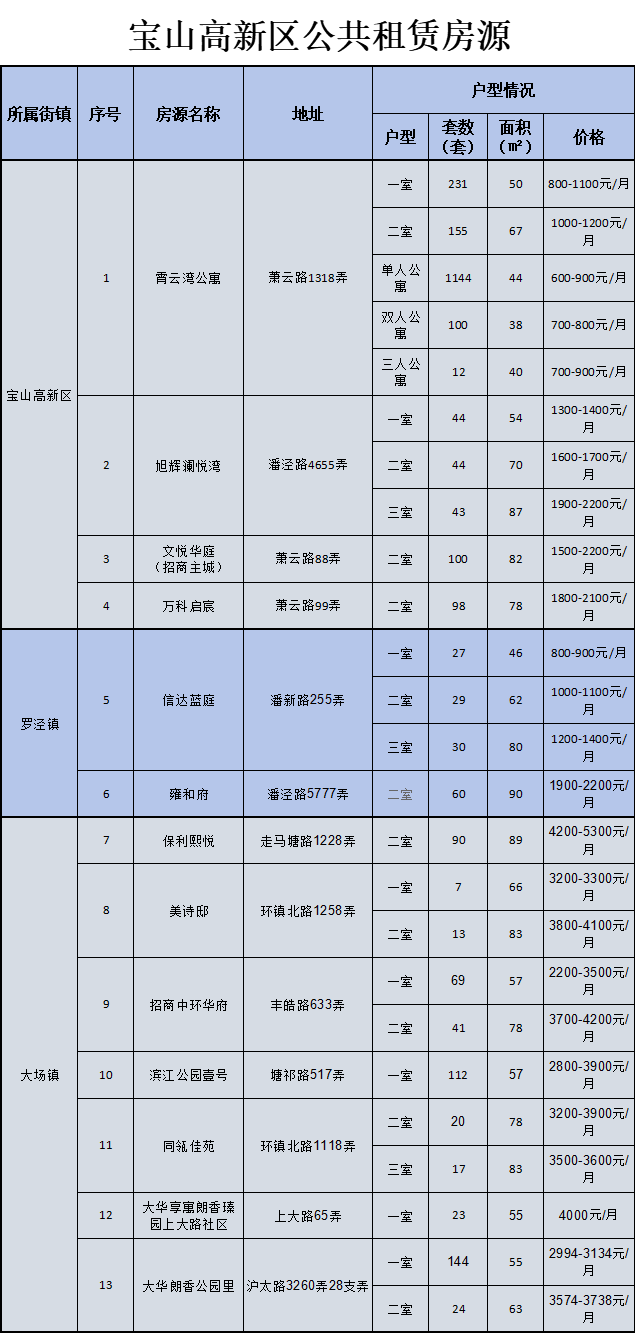 目前,宝山高新区及周边有13个公共租赁房源,包括北部区域霄云湾公寓、旭辉澜悦湾、招商主城、万科启宸,罗泾镇信达蓝庭、大场镇宝利熙悦等。