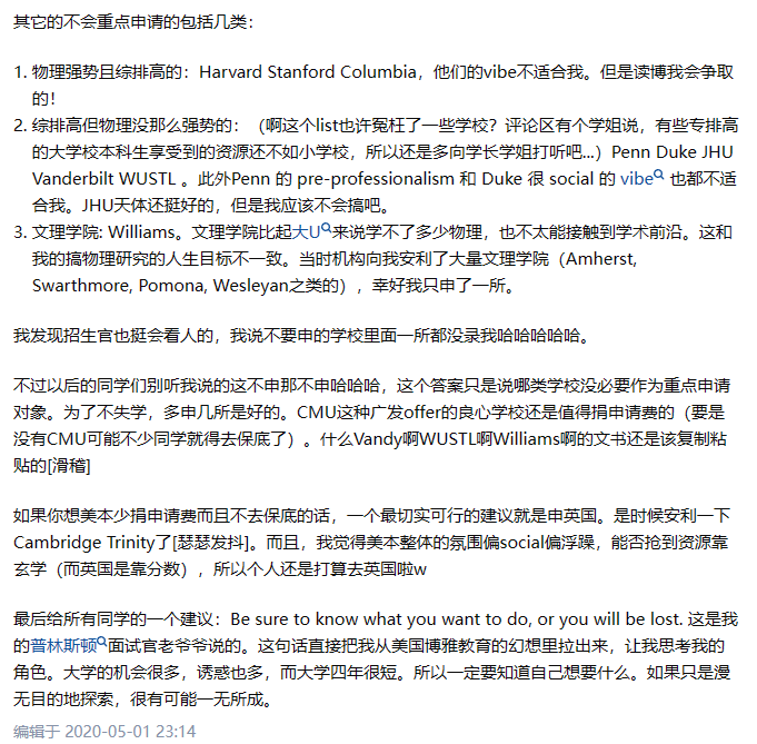 这位同学申请了14所美本,算是比较多的一个数量。但是她表示“如果能重来,文理学院说拜拜”。