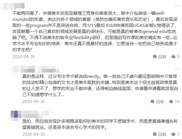 评论区的小伙伴也表示“亚裔理工男申美本难度很大,而且违心包装出来得到的offer并不是很适合自己”。