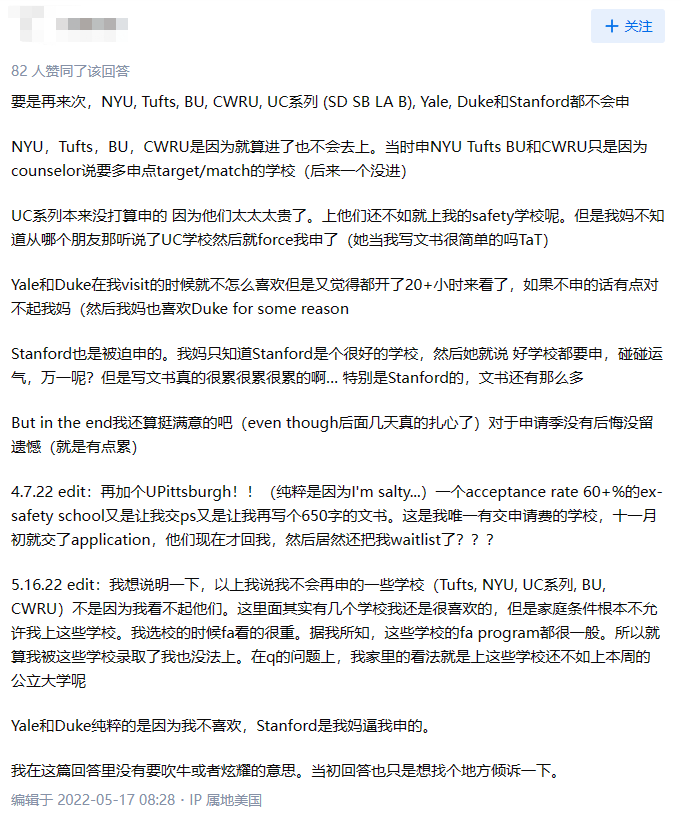 UC系太贵,NYU、Tufts、BU、CWRU就算拿到offer也不会去,申请Stanford是被迫的,Yale和Duke根本就不喜欢!!!