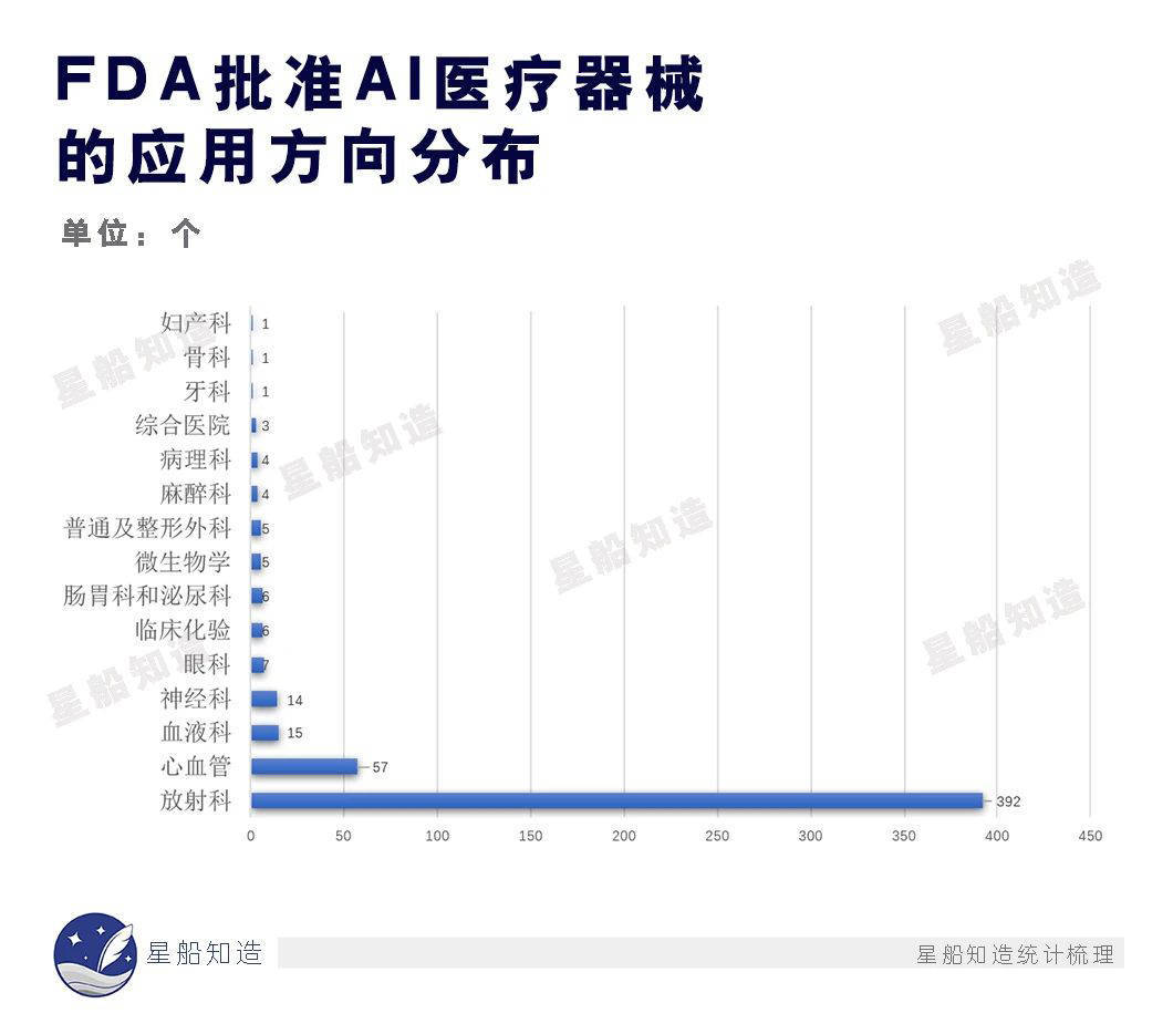 梳理美国FDA(美国食品药品监督管理局)截至2022年底累计批准的521款AI医疗器械,统计其应用科室后可看到,以识图阅片为主要工作的放射科承载了最多的AI器械。