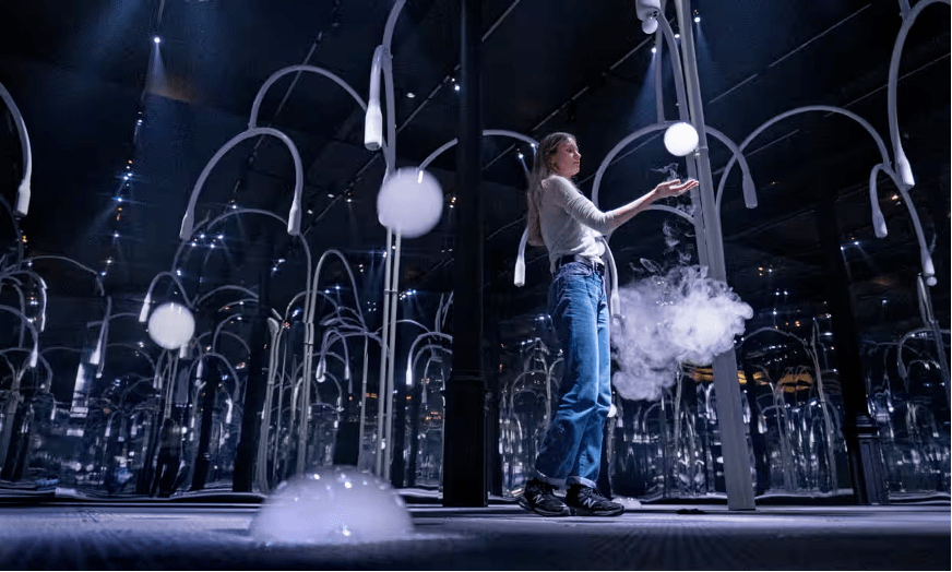 更重要的是,前文探讨的“沉浸式展览”所具有的那些潜能:即一方面开辟一方解放性的艺术空间;一方面提供一种规避“文化工业”的商业模式——也并不会随着“灯塔”的倒下而消逝无踪。事实上,除了“雨屋”之外,近年来还有另一些颇为优秀的“沉浸式艺术”作品出现。例如由艺术家双人组AA Murakami策划的“寂静的秋天”,这一展览在展区内设置了一片由机器树木组成的森林,空气中弥漫着植物和森林的香气,而这些机器树木会释放出雾气和气泡,人们可以触摸气泡,甚至戴着特殊的手套把它们抱起来。因此,不可否认的是,尽管存在一些粗制滥造的形式,但“沉浸式展览”仍然提供了一些弥足珍贵的可能,正如阿多诺所说“无论这种可能多么微弱,它都在伸出试探的触须。”
