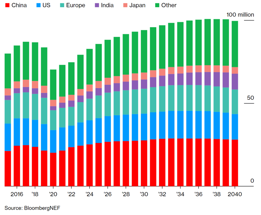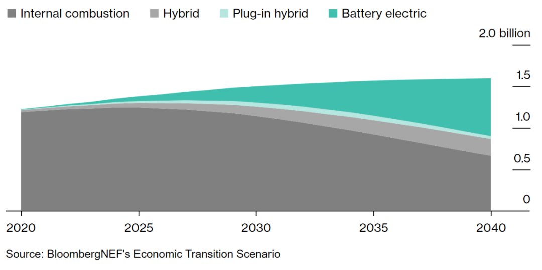 根据彭博新能源财经的展望,全球汽车年销量将在2025年恢复到2019年的水平,在2026 年恢复到2017年的水平,在2030年代末,销量将短暂突破1亿辆。