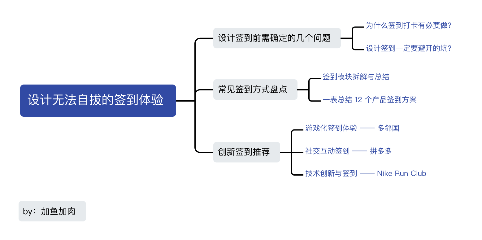 签到就是这样的例子,当我们做签到时,肯定不是只为了用户那一个动作完成。而是签到给了他回到产品的理由,我们就能在他的必经之路上,埋下伏笔,为更多业务引流。