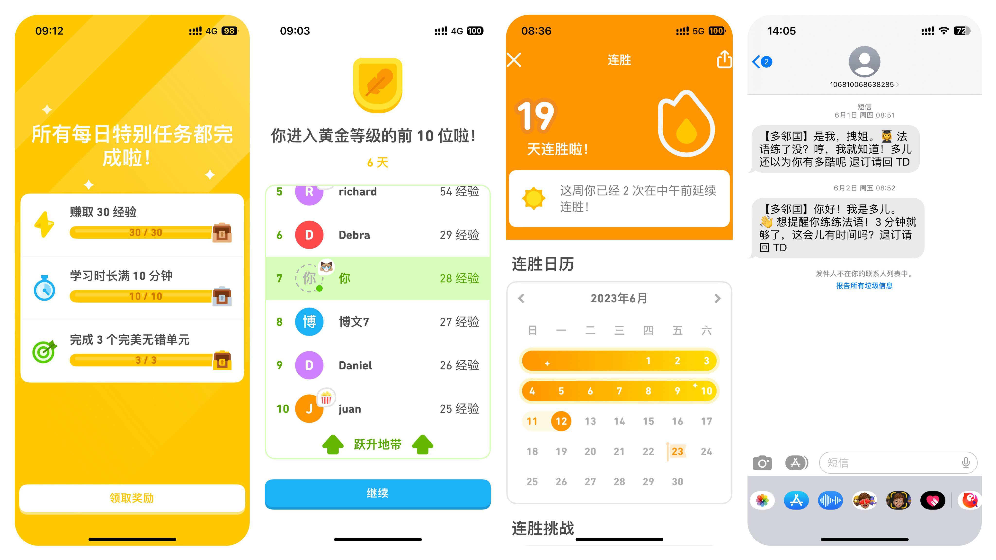 多邻国是我们常举的优秀案例,作为一款语言学习软件,它成功地将签到过程转化为有趣的游戏化体验。通过引入连胜挑战、排行榜和晋级系统,他们成功地将传统的签到活动注入了新的活力和动力。(Tips:产品团队确实有不少游戏平台经验)