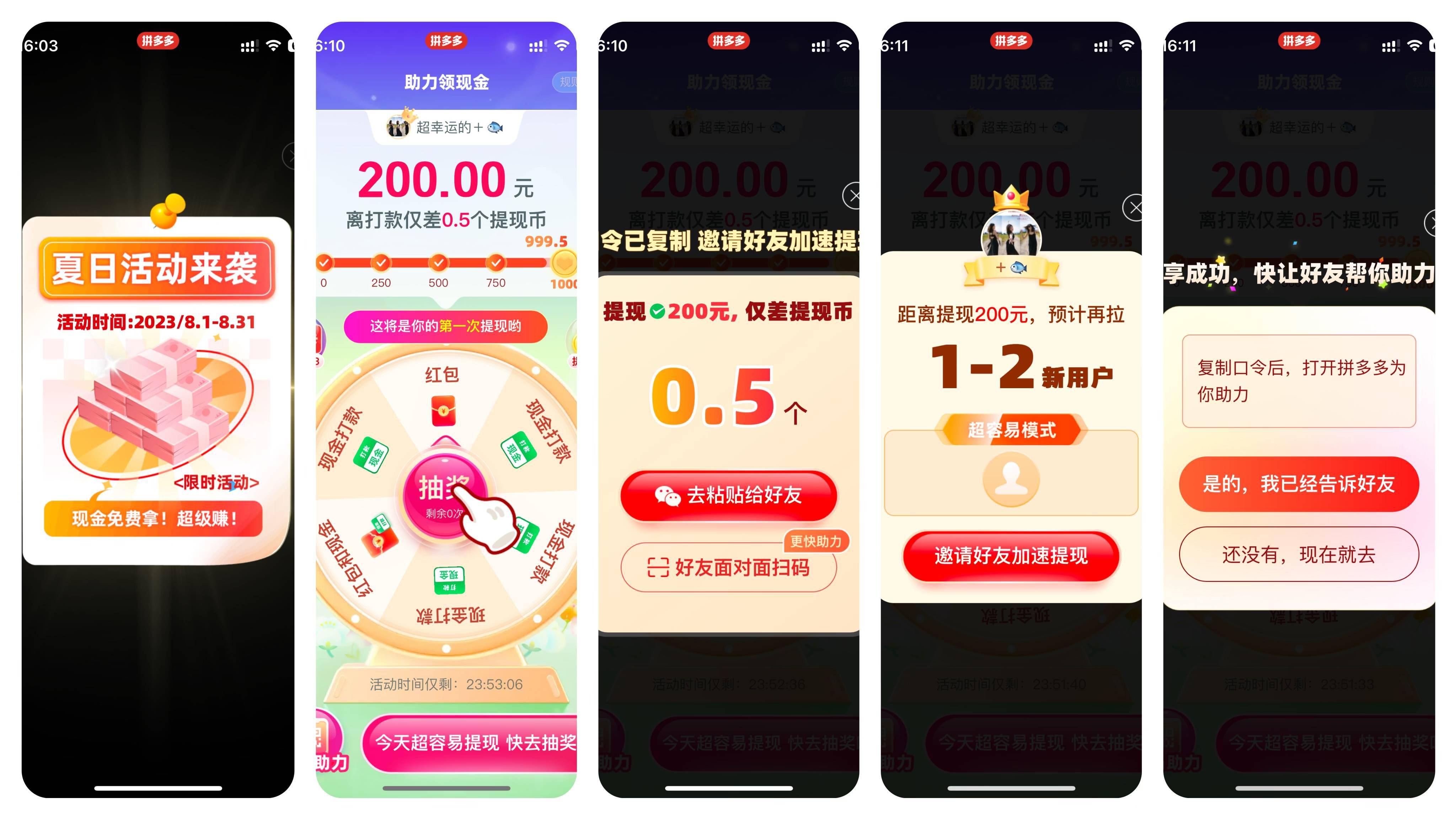 好友收到助力邀请后,也会进入该活动页面,被提现吸引,进一步参与并发起分享,提高裂变效应。