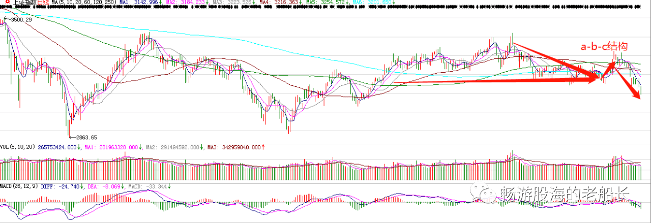 最近的连续下跌之后,日线级别长期以来构筑的大型震荡平台,被有效跌破,上证指数也回到了日线级别的年线下方,这意味着所有在大平台上介入的投资者都处在亏损状态。正是从这个角度出发,上证指数的a-b-c三段式结构得到了最终确认。现在,大盘指数处在比较大型的c段下跌状态。大盘回到三千点附近,是大概率事件。当然,途中也会有反弹。不过,对于A股来说,越接近三千点,安全系数越高。所以,未来一段时间,A股会不断靠近三千点。当然,下跌的速度也会从快到慢,逐步降下来。c段,是诛心的下跌段。