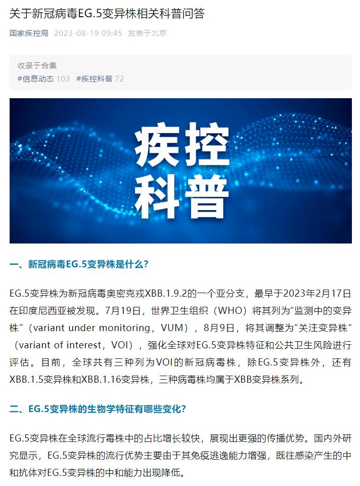 我国监测结果显示,新冠病毒流行株中EG.5变异株占比呈上升趋势,从4月的0.6%增长至8月的71.6%,目前已在我国绝大多数省份形成优势流行,未来一段时间内很可能继续保持此趋势。我国今年4-6月份经历了奥密克戎XBB系列变异株的流行,已建立的人群免疫力对同属于奥密克戎XBB亚分支的EG.5变异株仍具有免疫保护作用。近期,全国新冠疫情总体处于低水平、波浪式流行态势,疫情对各地医疗系统带来的压力较小,短期内不会发生规模性疫情。