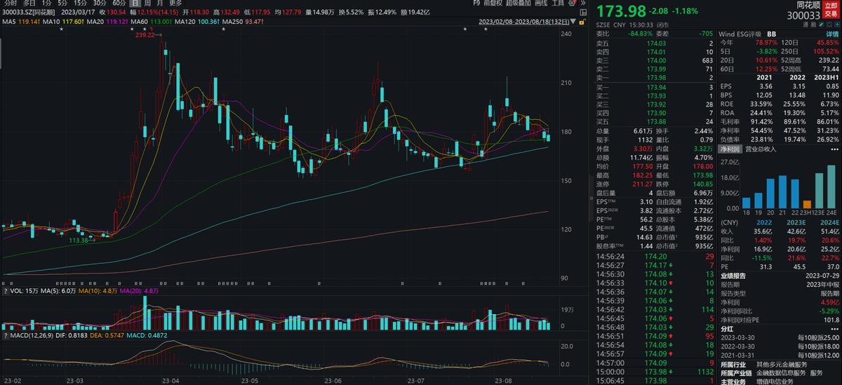 受上述因素影响,减持当日同花顺暴跌8.2%至收盘价176.46元/股,次日继续跌至173.83元/股。若按28日收盘价计算,减持的8.46%股份有80多亿。截至8月18日,同花顺报收173.98元/股,最新市值935亿元。