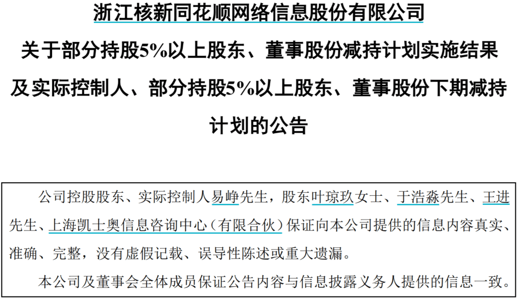 3月28日凌晨,同花顺抛出的一份减持公告称,实控人、董事长易峥、董事叶琼玖,凯士奥、于浩淼、王进拟自公告发布之日起15个交易日后的六个月内,以集中竞价交易方式或大宗交易方式合计减持公司股份不超过4550万股(占同花顺总股本的8.46%)。