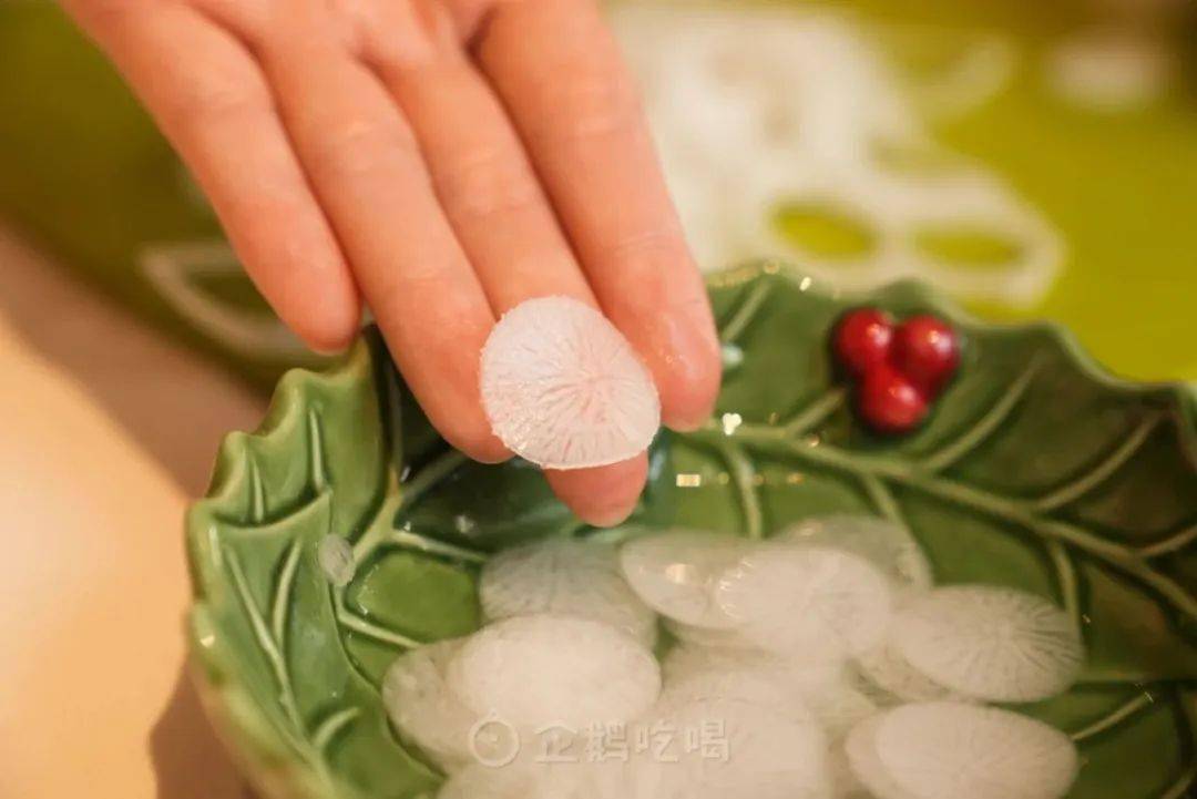 白萝卜也同样切成极薄片,用裱花嘴刻成圆型,模仿鱼鳞,一同泡入泡菜汁,主打一个栩栩如生。