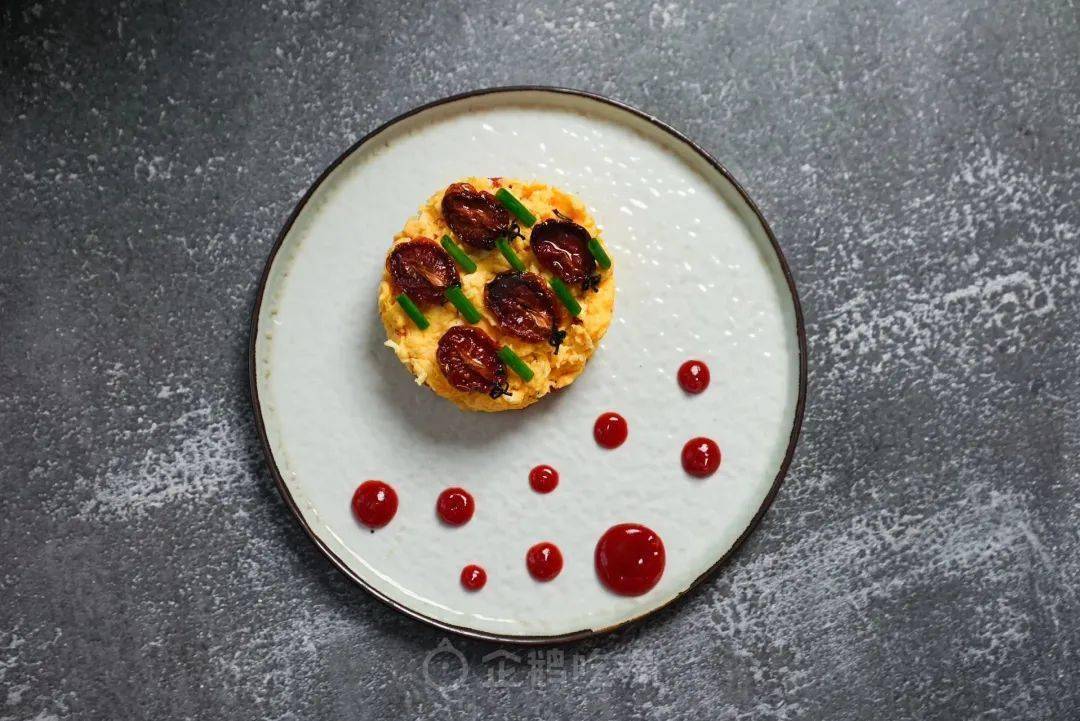 用模具最方便,没有的话也可以拿小碗整型,鸡蛋topping铺上风干小番茄、葱段,旁边再用番茄酱装饰几点,成了。