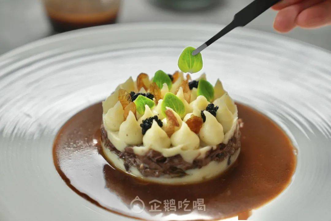 比如这道土豆炖牛肉,家家都会做,但如果你把炖牛肉拆碎,土豆做成泥,用裱花袋摆个盘,看起来身价翻上几番都不止👇。