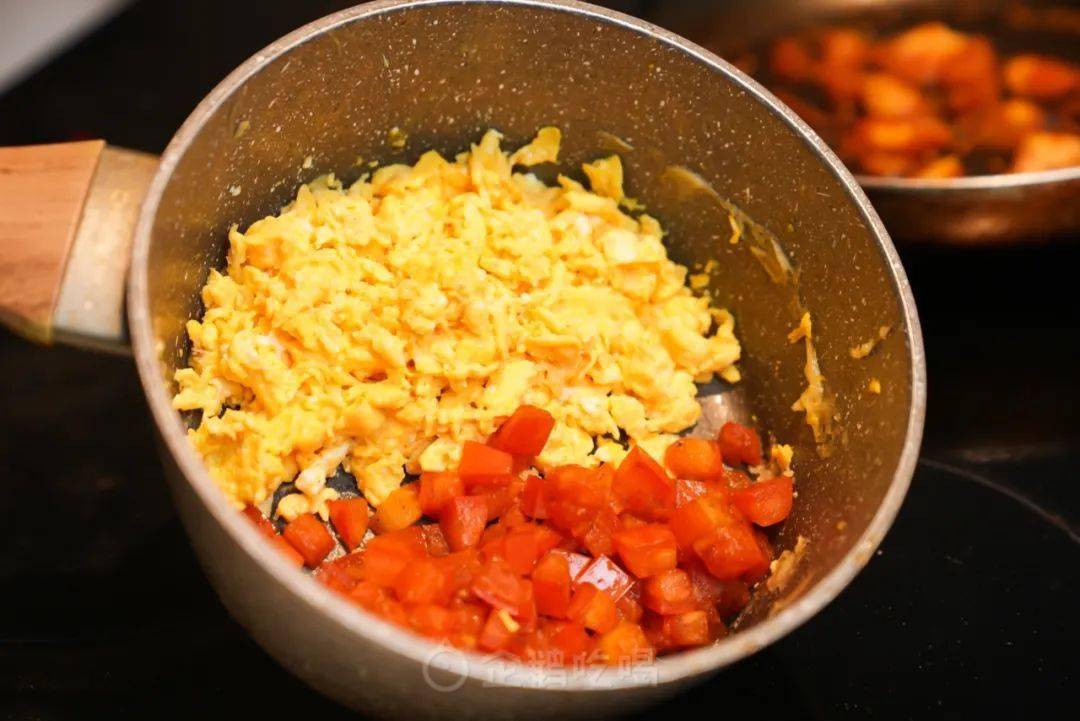 将切好的番茄小丁,翻炒1min变软后立刻出锅,与炒好的鸡蛋混合。