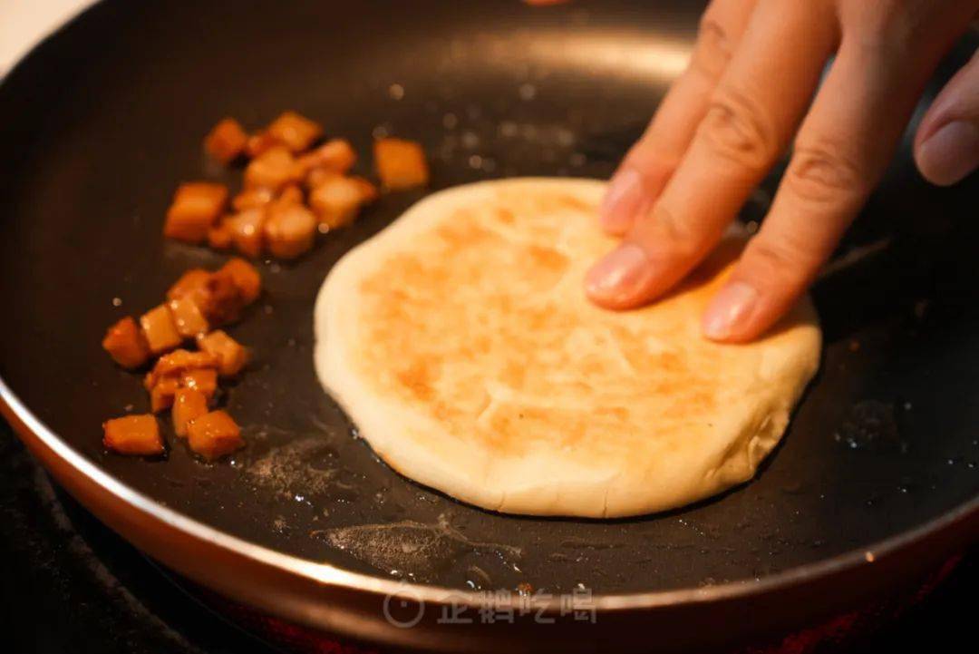 取一部分猪肥膘,切成小丁熬成猪油渣,在猪油中将白吉馍两面烙得焦脆,增加一点香气与质感。