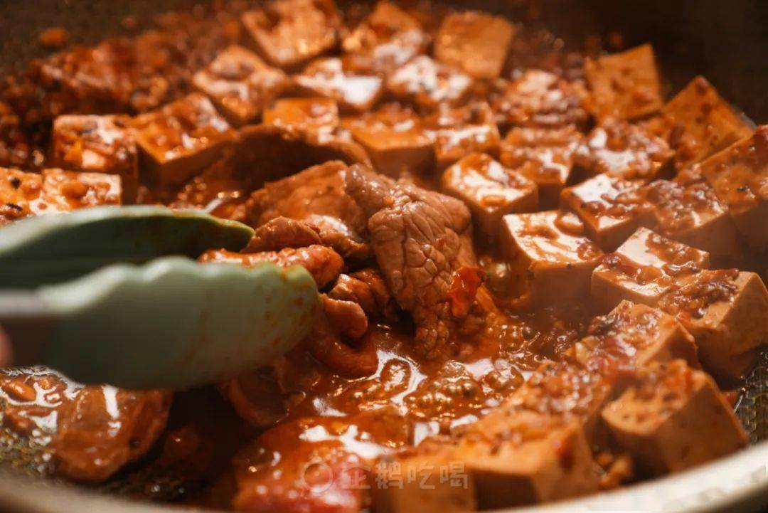 然后就按正常麻婆豆腐的烧法,加入牛筋一同炖煮。老豆腐和牛筋入味需要比较长的时候,建议煮30min左右。