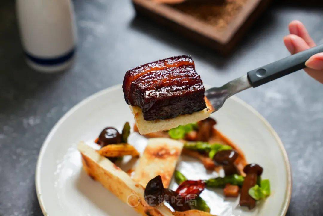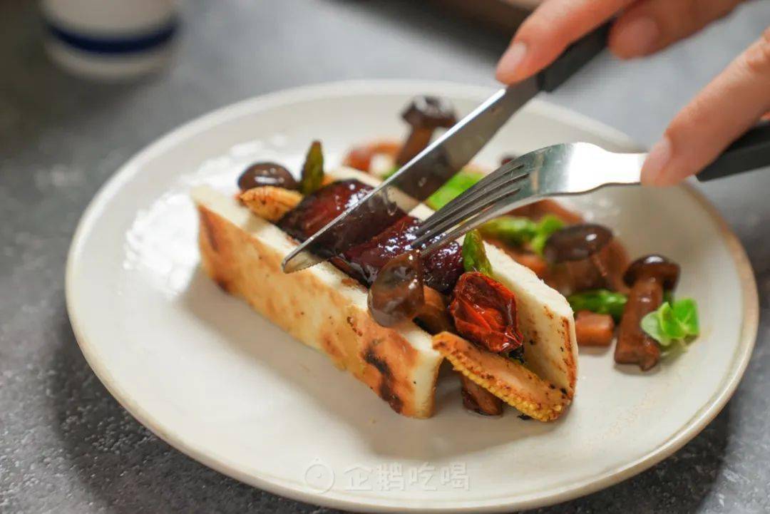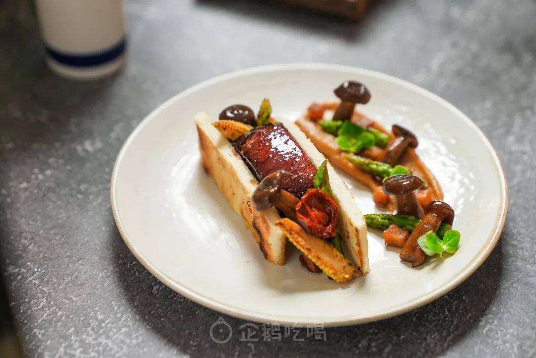 接下来就可以开始摆盘咯:白吉馍切成长方体,中间夹卤好的五花肉,芦笋、蘑菇竖着摆出丛林感,淋上卤汁。