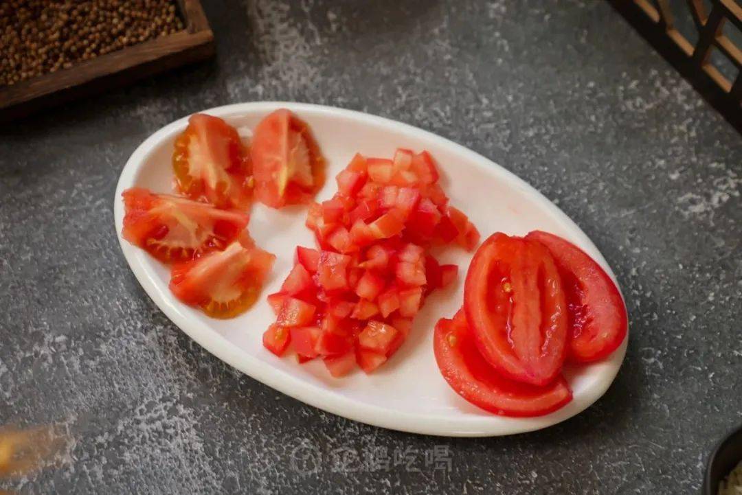 用两种番茄,焕发出不同风味:风干小番茄、切碎的番茄丁(tomate concassé)、番茄芯熬酱汁。