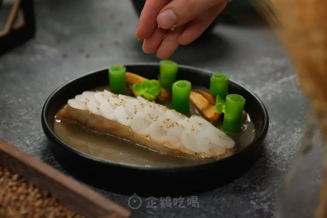 接下来就可以进行摆盘啦:用白萝卜片模拟鱼鳞,铺在鱼排上,再撒一些白芝麻增香;渍好的莴笋片卷成卷状,淋上酱汁。