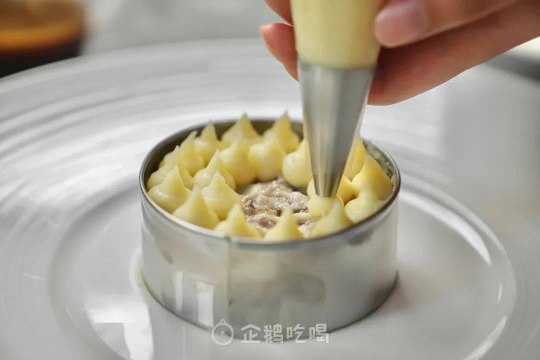 我们把土豆泥装入裱花袋中,像做甜品组装一样:在圆形模具中先铺一层土豆泥,铺一层牛肉碎,再挤一层土豆泥裱花。