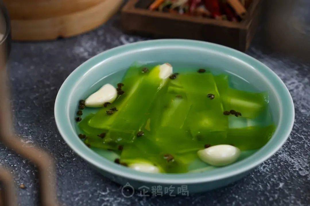 我们再来做一些带酸度、让整道菜更清新的配菜,比如用白醋+青花椒+大蒜+盐+糖调成跳水泡菜汁,放入莴笋片腌渍10分钟。