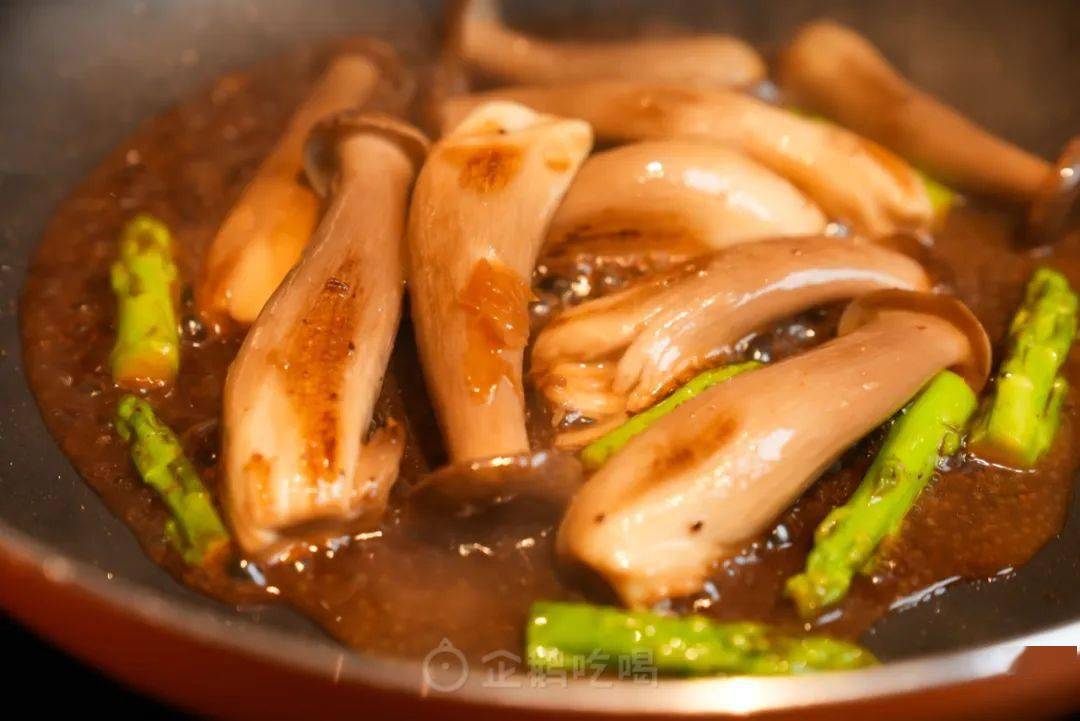 为了摆盘好看,可以再丰富一下配菜:菌菇、芦笋都是猪肉的好搭档。在猪油中炒香蔬菜后,只要加一勺卤肉汁调味收汁即可。