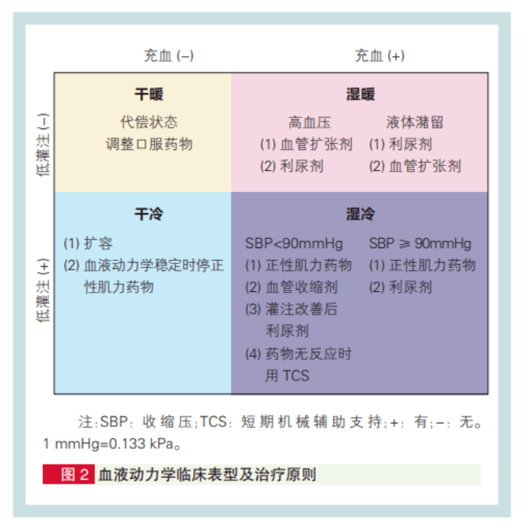 血液动力学状态调整:急性心力衰竭患者血液动力学分为干暖、干冷、湿暖、湿冷4 种临床表型,其治疗原则见图2。