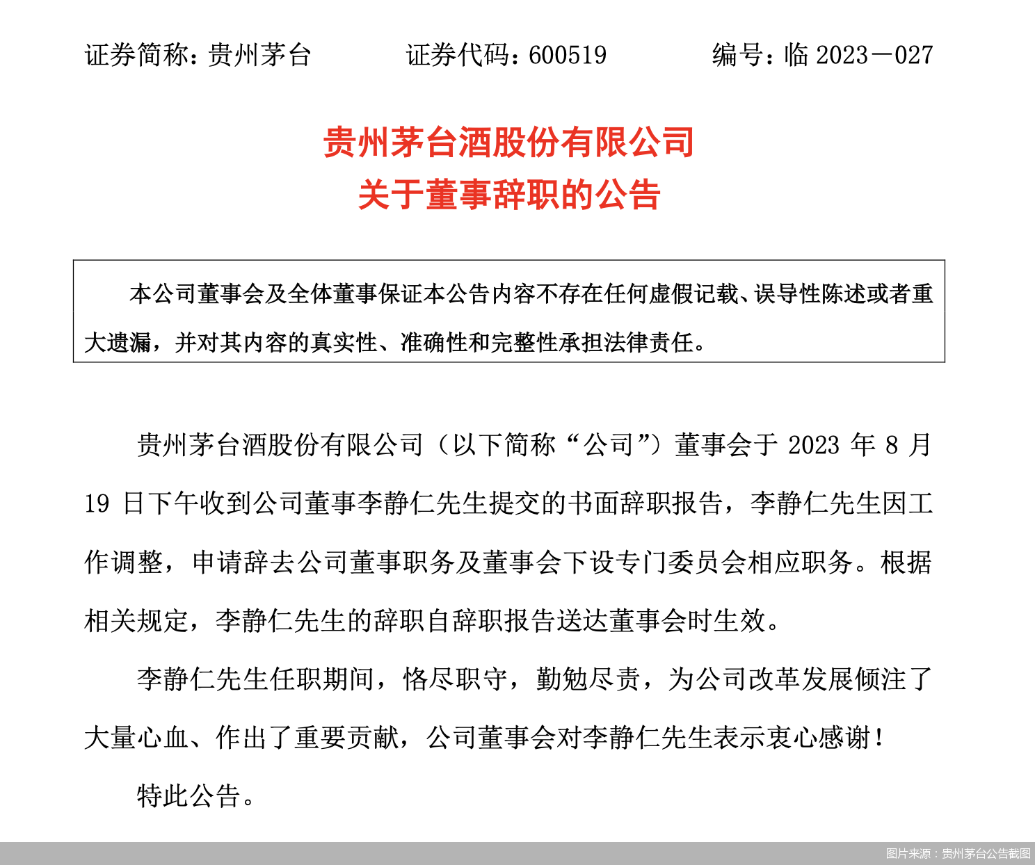 同日,贵州茅台发布《关于董事辞职的公告》显示,董事会于8月19日收到公司董事李静仁提交的书面辞职报告,因工作调整,申请辞去公司董事职务及董事会下设专门委员会相应职务。