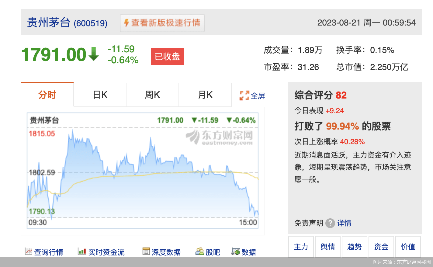 在贵州茅台酒股份有限公司(以下简称“贵州茅台”)(600519)发布人事调动后首日,资本市场略显消极。8月21日,贵州茅台以-0.64%涨幅收盘,股价达1791元/股。