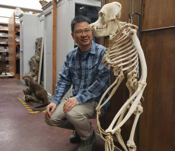 张国捷在标本库,身边标本为红毛猩猩骨架
