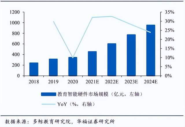 据多鲸教育研究院《2022中国教育智能硬件行业报告》显示,随着双减政策的落实、传统培训需求的转入,K12教育智能硬件市场增速迅猛,预计2024年我国教育智能硬件市场规模将突破950亿元。