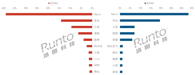 根据洛图科技《中国智能平板零售市场月度追踪》数据显示,2023上半年,苹果、华为、小米稳定占据TOP3,合计份额达62.5%。其中,华为的市场份额较去年同期有所下滑,新品销售不及预期,但依然位列安卓阵营第一名。小米在整体线上市场的份额为9.4%,较去年同期增长了2.2个百分点。