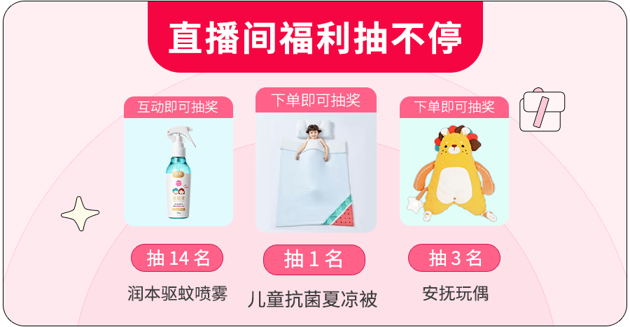 如果在直播间下单任意金额,每小时就能免费抽取「小狮子安抚玩偶」,直播结束前还有大奖价值 189 元的「儿童抗菌夏凉被」送哦!福利真的超级多,千万不要错过了!