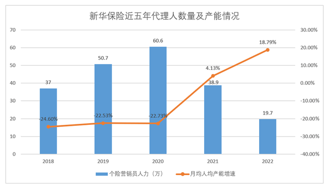 针对代理人持续脱落,个险渠道亟待面临转型的新方向下,新华保险强化了绩优队伍建设,确定了“提高人均产能、优化队伍结构、稳定队伍收入”三步转型和基本法改革,推动营销队伍逐渐转向年轻化、专业化、城市化。虽然其人力规模依然缩水,2022年个人营销员人力约为19.7万人,较2021年的38.9万人,同比减少了49.36%。但可喜的是,2022年的月均人均综合产能却同比大幅提升了18.79%。