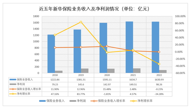 如果拉长周期来看,新华保险业务收入增速从2020年开始结束了两位数高增长势头,逐渐开始回落,其中2022年其保险业务收入同比2021年下降0.23%至1631亿元,是近些年来出现的首次负增长情况。