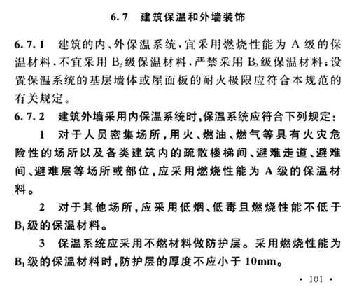 GB50016-2014《建筑设计防火规范》(2018年修订版)明确规定建筑的内、外保温系统,宜采用燃烧性能为A级的保温材料,不宜采用B2级保温材料,严禁采用B3级保温材料。