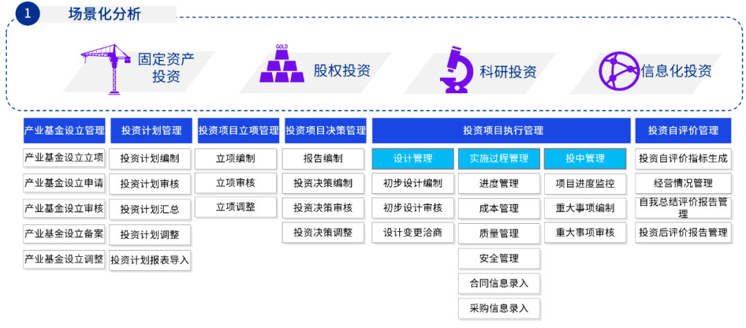 对企业投资的业务场景进行分析,明确企业投资类型,科学划分投资专业,聚焦不同投资业务类型的投资场景,细化各场景下业务需求、业务规则及业务管控关键点,为企业提供定制化解决方案,支撑企业全场景、全类型投资业务的集约化、标准化及个性化管理。