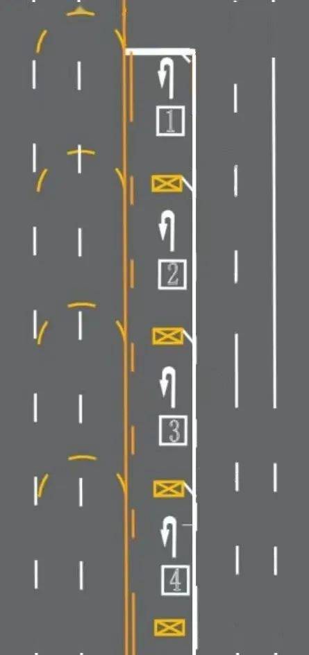 ▲施划了4个“联动掉头”通道,允许4辆掉头车辆同时掉头。