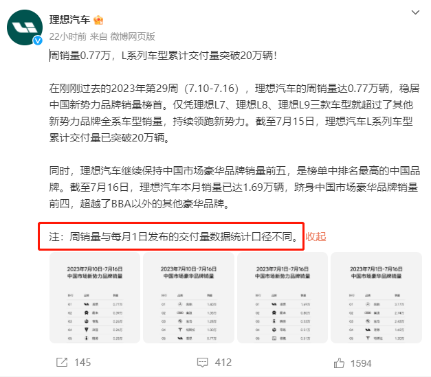 理想汽车表示周销量与月交付量数据统计口径不同(来源:理想汽车官方微博 )
