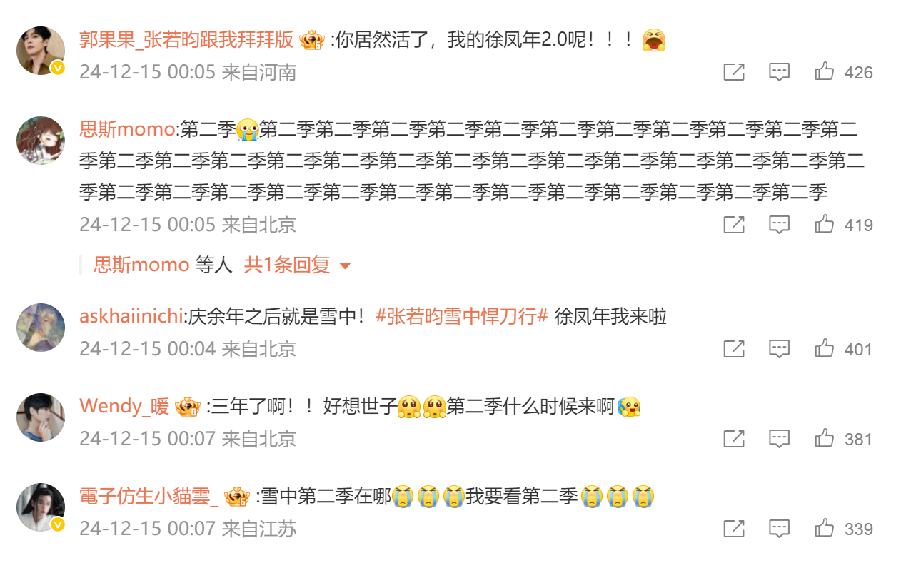 直到2024年12月份,《雪中悍刀行》官微罕见的发布一条“开播三周年福利限免”活动,让原本死了心的《雪中》剧迷们又沸腾了起来,频频询问第二季在哪里?
