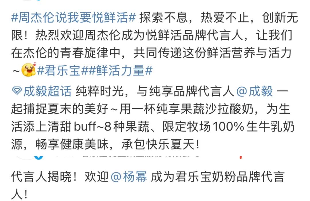同时,很多大品牌还会同时选择好几位代言人,像君乐宝就有白敬亭、杨幂、成毅等好几位代言人,分别代言了不同的产品。