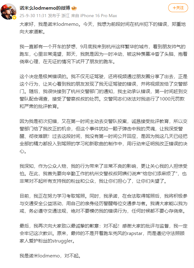 9月29日下午,诺米舅舅向记者证实此事并称是诺米试驾朋友跑车,当时他看到跑车刚好就想到要试一下,毕竟是他自己犯的错误,肯定要承认,“罚款马上就要交”。