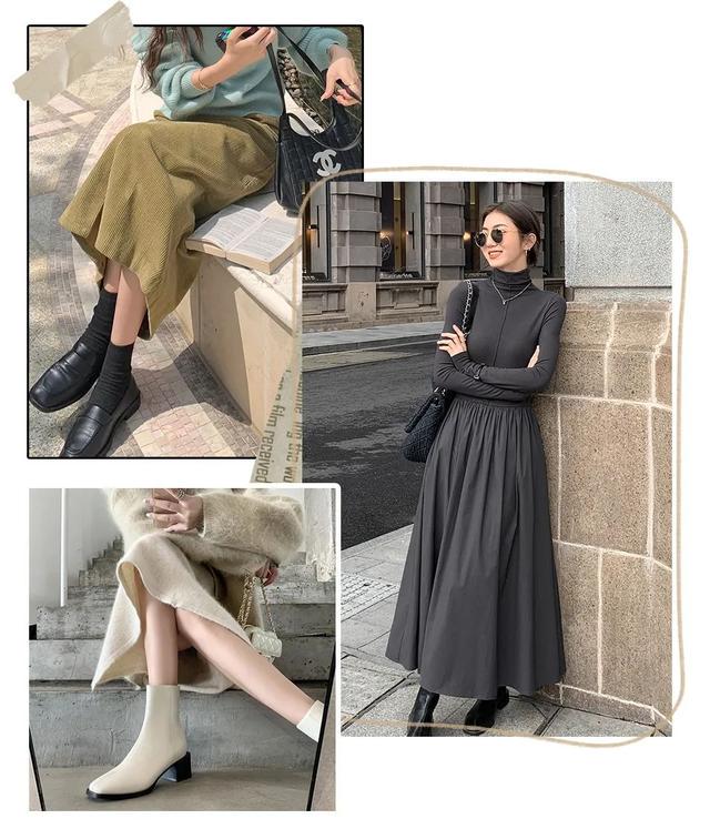 因为脚踝是被包裹住的,搭配微微扩张的裙摆,视觉上一紧一松,可以修饰腿部的线条,到达显瘦的需求。