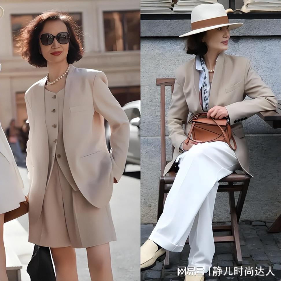 搭配上,她们更懂“松弛感”的秘诀,不会把西装穿得紧绷刻板,而是会选择比自己身材大一号的版型,下身配一条垂感好的阔腿裤,既显腿长又不失随性。